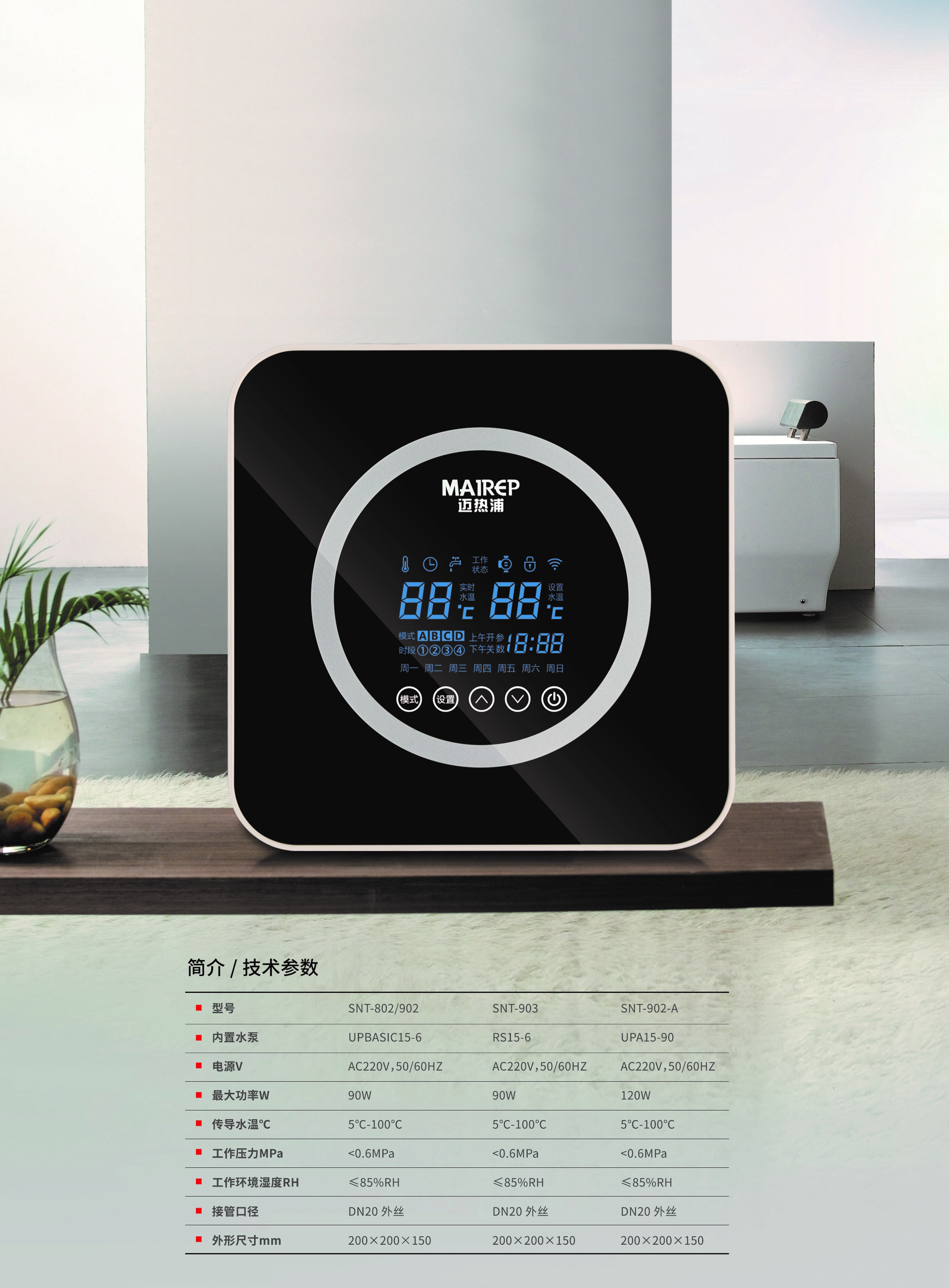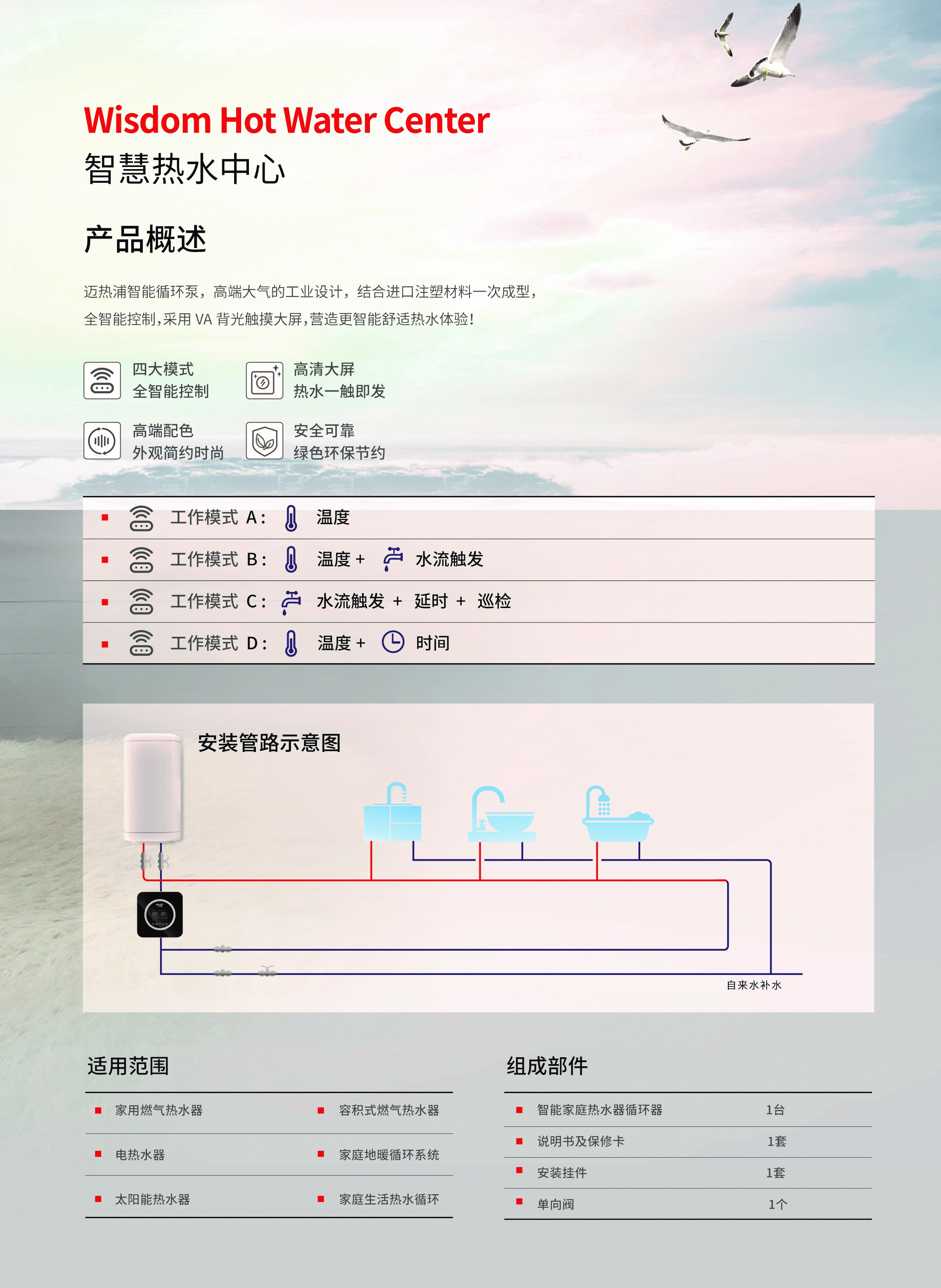 邁熱浦智能循環(huán)泵,高端大氣的工業(yè)設(shè)計(jì),結(jié)合進(jìn)口注塑材料一次成型,全智能控制,采用VA背光觸摸大屏,營造更智能舒適熱水體驗(yàn)!